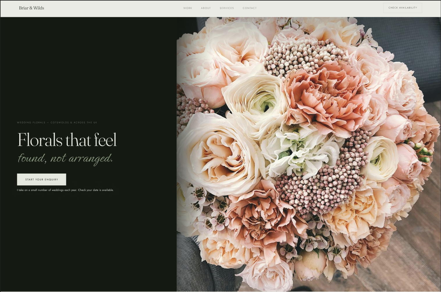 A botanical, editorial website for Briar & Wilds, a Cotswolds-based wedding florist known for naturalistic, garden-grown arrangements. The site needed to reflect the florist's deeply personal approach to floristry while giving potential clients the clarity they needed to enquire with confidence.